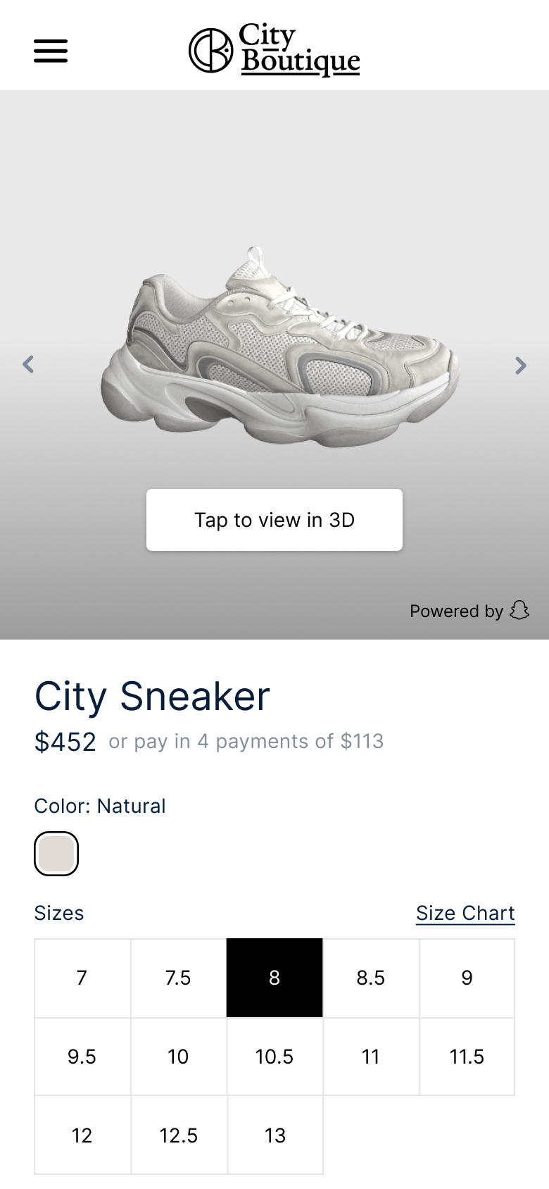 The 3D Viewer allowed us to inject the same assets used for AR into the traditional e-commerce product image carousel. Customers could rotate, zoom, and inspect items in high detail from the stitching on a shoe to the texture of a handbag. Designed to integrate seamlessly within a merchant’s product page, it offered an intuitive, low-latency experience across devices and browsers.