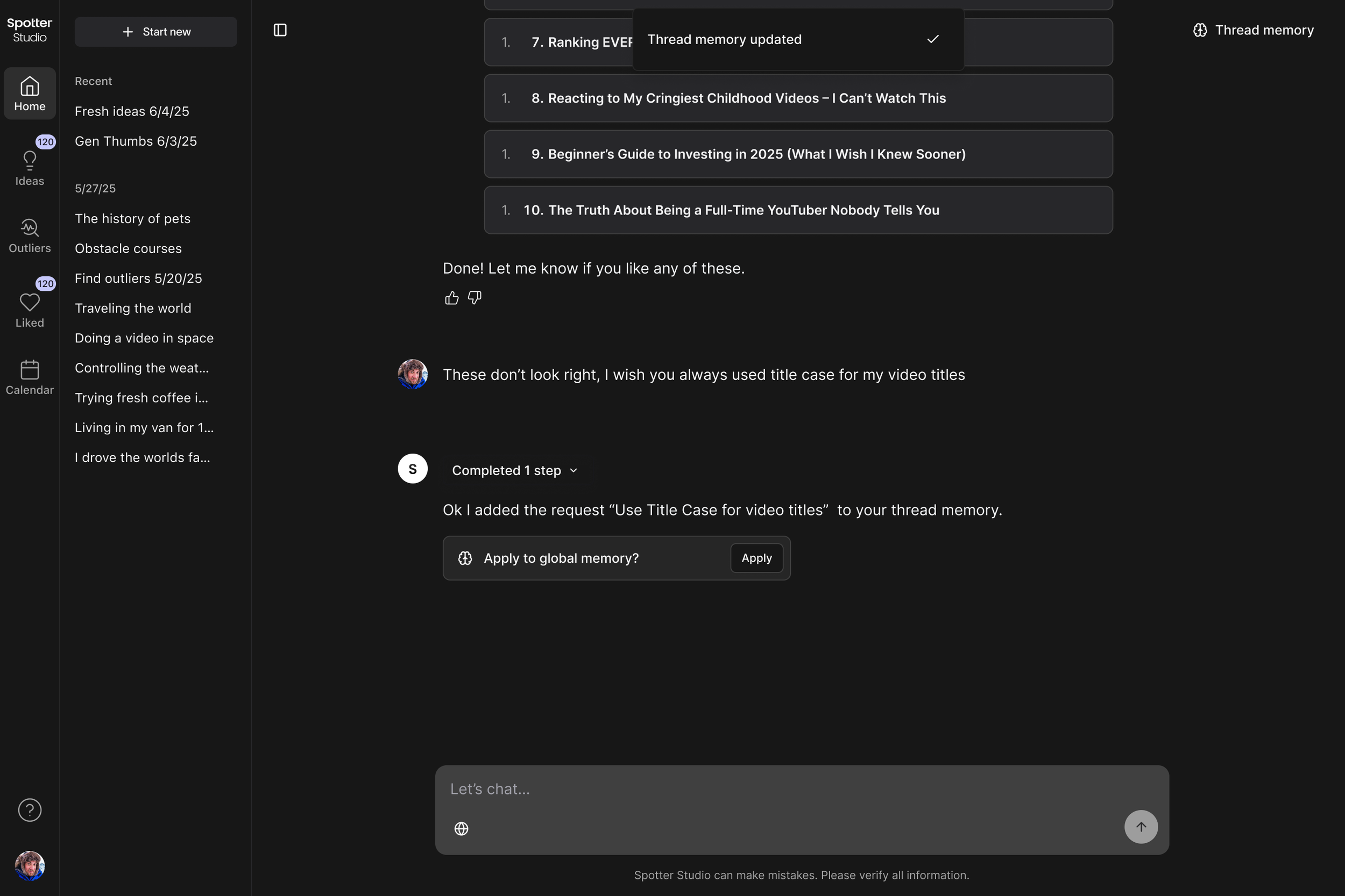 In order to make the platform feel like a real creative partner instead of a standard chatbot we needed to figure out how best to incorporate memory. The AI needed to remember the creator’s style, ideas you’ve liked, projects you’ve working on, and the way you talk about your content. This lets the platform build on past conversations, keep track of long-term concepts, and give you ideas that actually fit your brand.